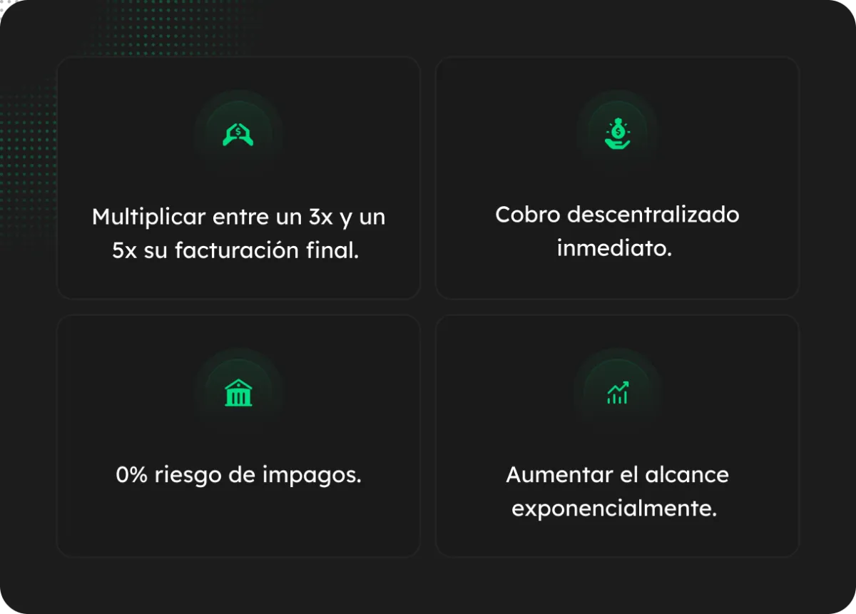Dar acceso a financiamiento inmediato a 5,000+ info productores y negocios online en los próximos 24 meses, aumentando sus ventas entre 50% y 200% gracias a la opción de pago en cuotas, mientras reciben el 100% de su dinero de forma inmediata en criptomonedas.